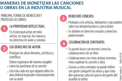 La propiedad intelectual se divide en dos secciones, los derechos de autor y los conexos. El CEO de Destra Entertainment Lawyers explicó que los derechos de autor protegen las obras literarias, artísticas y científicas. Además, recalcó que desde el momento de su creación, las canciones adquieren estos derechos, sin embargo, deben de estar plasmadas en algo tangible como las partituras de las baladas o la letra de esta misma para el caso de los artistas musicales.