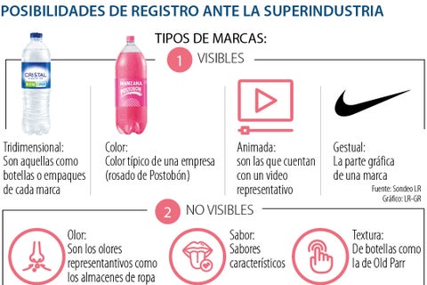 Las visibles son aquellas cuyas caracterÃsticas son fácilmente observables, como las tridimensionales (empaques o botellas con diseños únicos. También están las animadas, que son los videos representativos de una empresa o producto. El color también se puede registrar, como el rosado especÃfico de Postobón, y las gestuales, que son la parte gráfica. La SIC agregó que otro tipo de marca son las no visibles, en las que se encuentran las olfativas, las de sabores y texturas.
